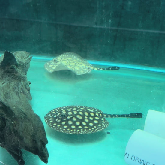 The Pearl Stingray originates from the Tapajos River in Brazil. It is characterized by a golden brown base with black rings. In this albino morph, the colors are reversed so we get white rings on a golden red base.