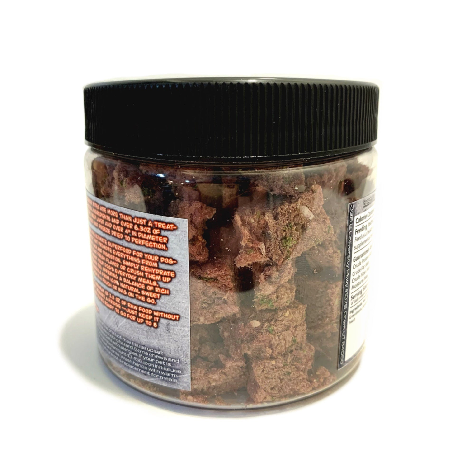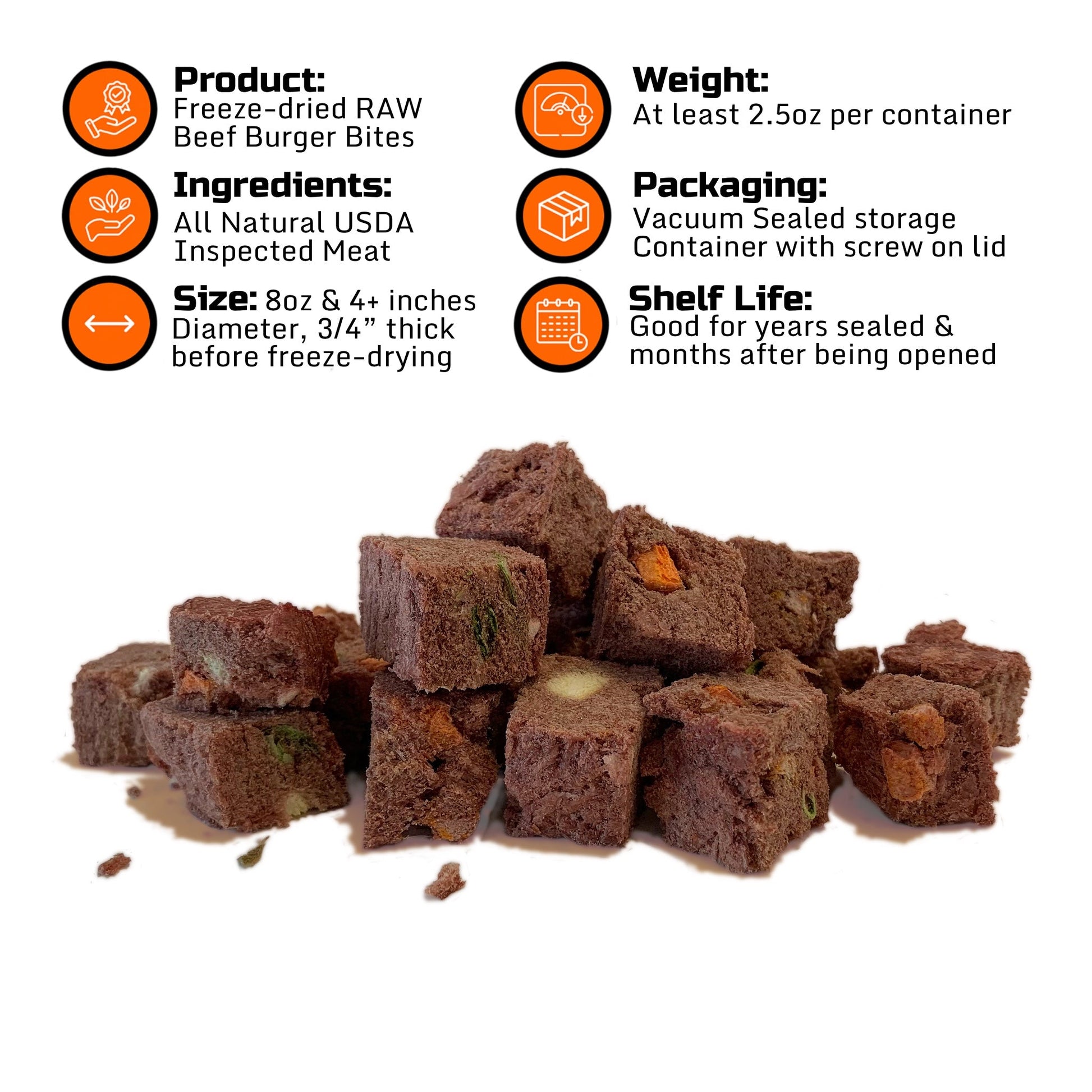 Our freeze-dried raw Beef Burger Bites are more than just a treat—they started life with all natural ingredients and over 8oz, over 4” in diameter and 3/4” thick before being freeze dried. Each container has at least 2.5oz of burger bites. In a vacuum sealed storage container good for several years. After opening they are still good for at least 6 months if stored correctly.