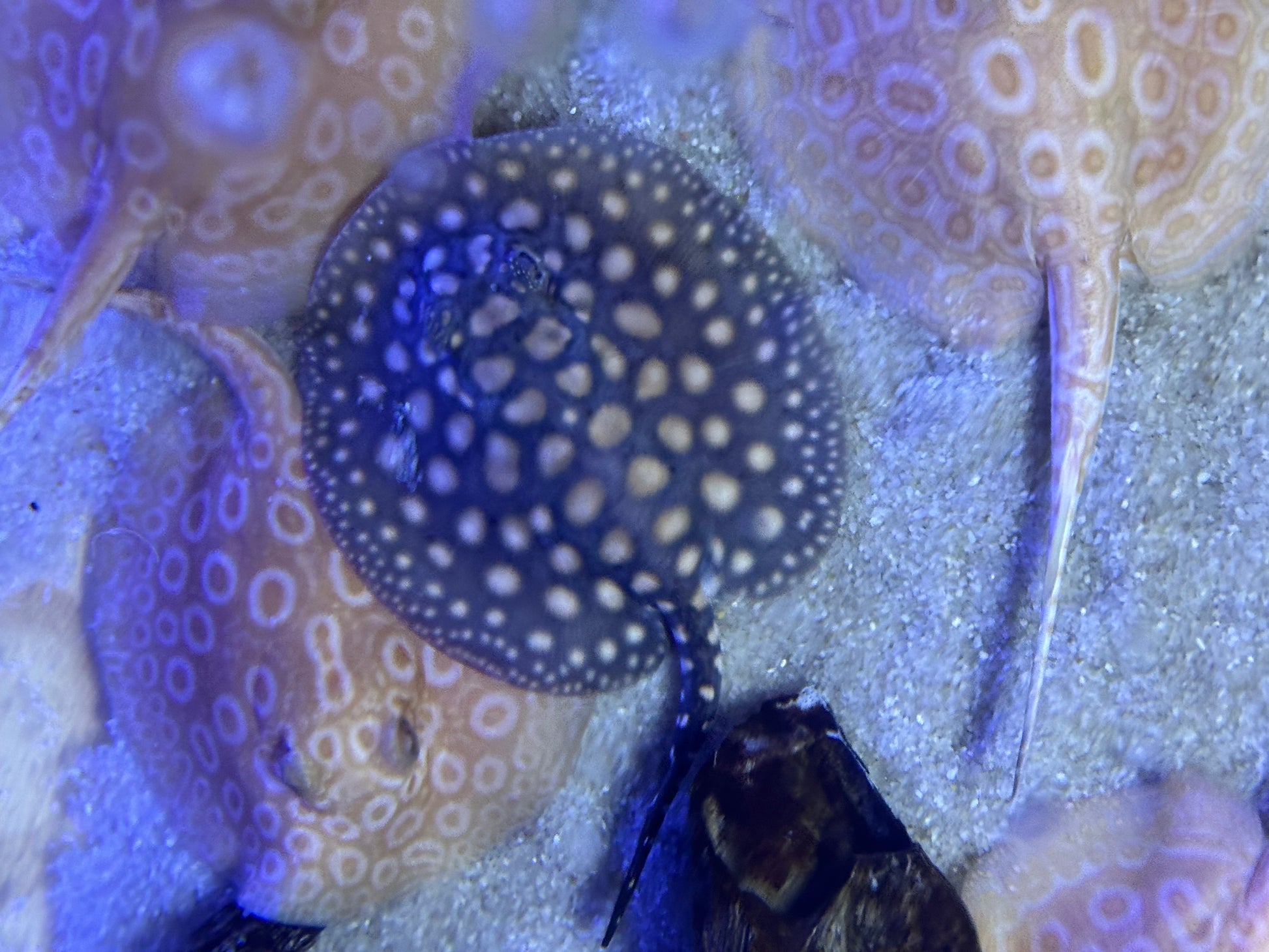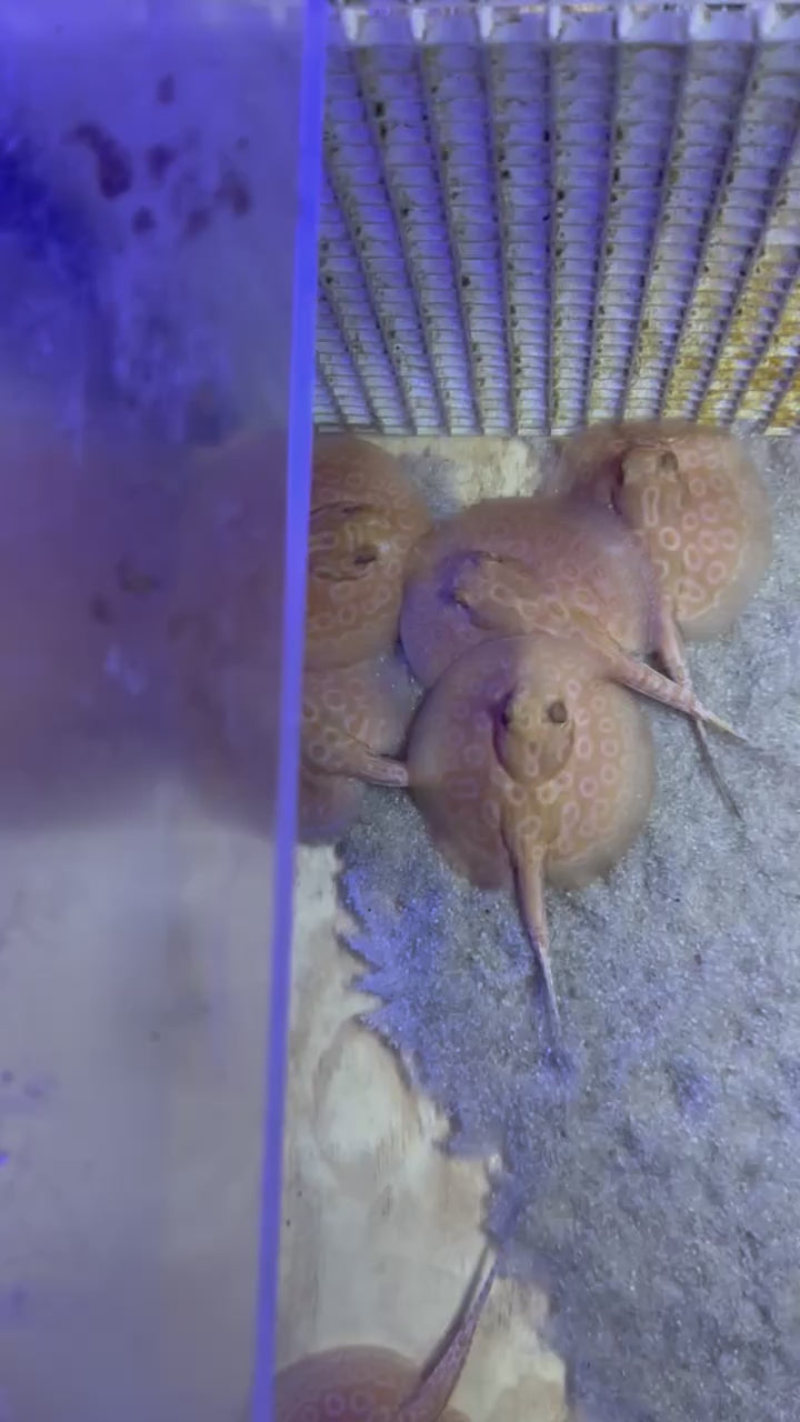 Black Diamond Super Hybrid Freshwater Stingray is combination of mainly Black Diamond and other types of black based stingrays. The breeding stock used in the hybridization process are carefully selected for the best traits possible. These hybrids are created to improve spotting, patterns and color. In this case "Super" refers to increased amount of spots.