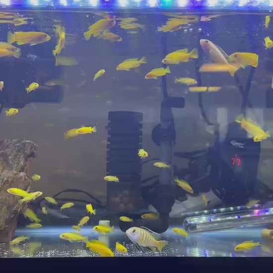 Pseudotropheus saulosi is classified as a dwarf Mbuna, reaching a size of only 3-4 inches. These colorful little fish come originally from the Taiwan Reef area of Lake Malawi. The males are blue with black vertical bars, and the mouthbrooding females are deep yellow. Fry are all yellow as well, changing colors at maturity.