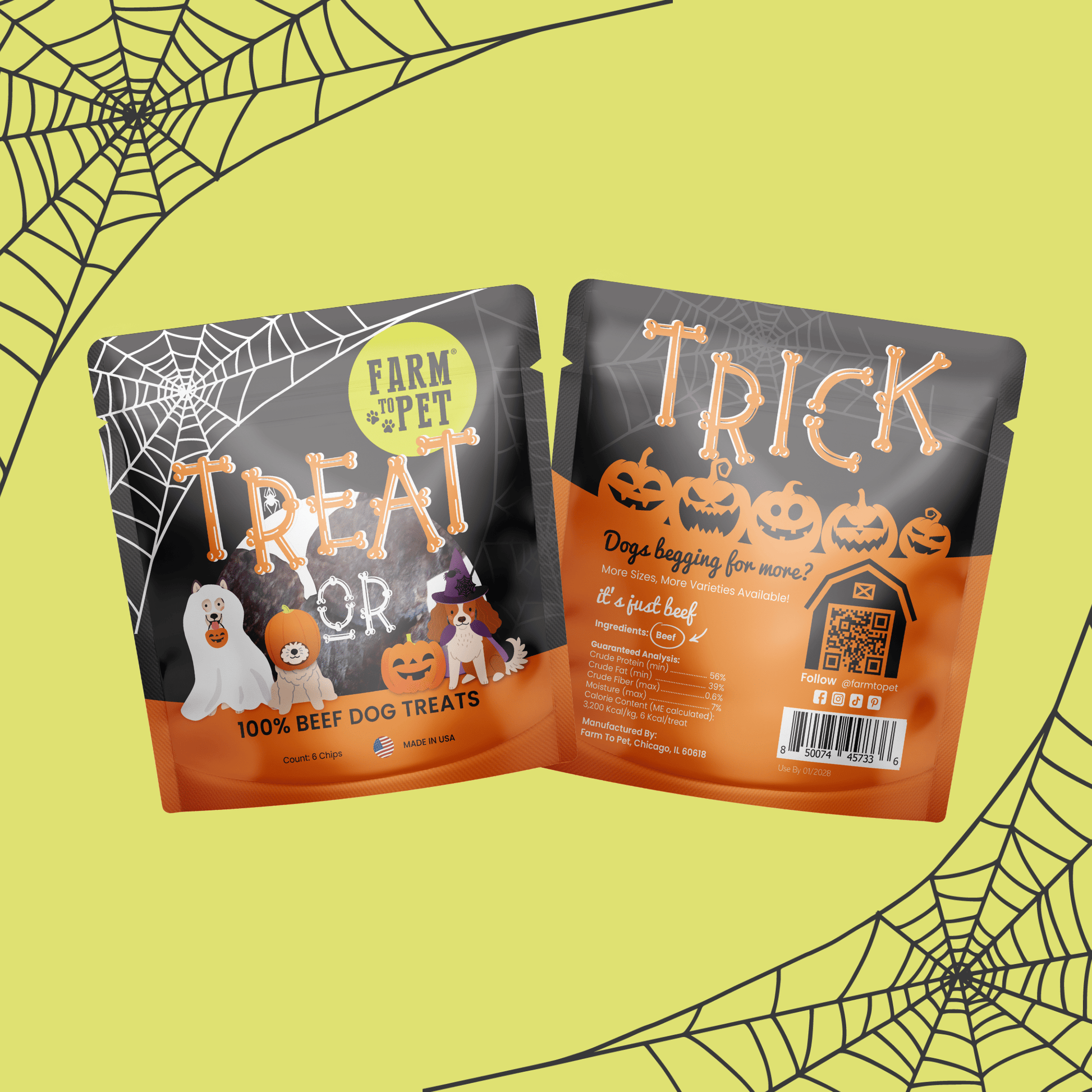 Farm to Pet’s Turkey, Beef, Fish, and Chicken Chips are the best healthy dog treats all year, but at Halloween, they get a spook-tacular twist! With 24 assorted bags, these frightfully fun Snack Pack bundles serve up essential pet nutrition, delicious flavor and irresistible crunch in every dog treat inside. Treat pups all Howl-o-ween season with these grab-and-go goodies that pair paw-fectly with any pet Halloween costume!