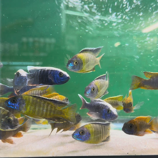 A variety of the African Butterfly Peacock, this color morph was selected for its striking blues and yellows. The fins, forehead and shoulder area of the Lemon Jake Peacock is bright yellow in color with varying dorsal and tail trim.