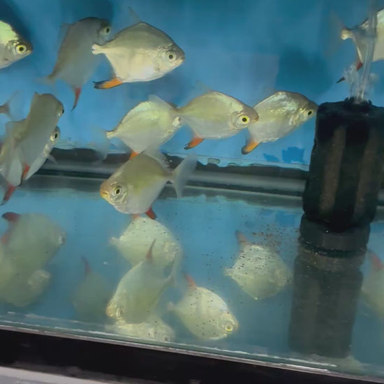The Red Hook Silver Dollar is a popular, colorful schooling fish found throughout the Amazon Basin in South America. A relatively peaceful fish, they do best in groups of 5 or more and make an excellent “dither” fish for large cichlids or other predatory fish species. They also add activity to the upper levels larger aquariums with their constant, rapid swimming and close schooling behavior.