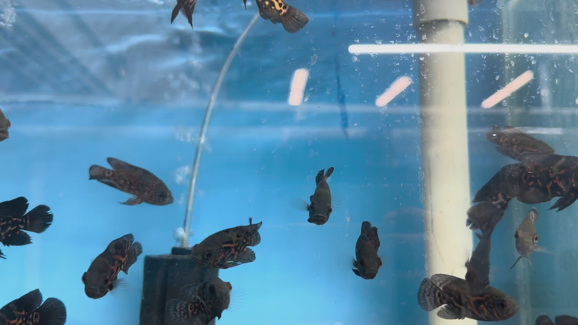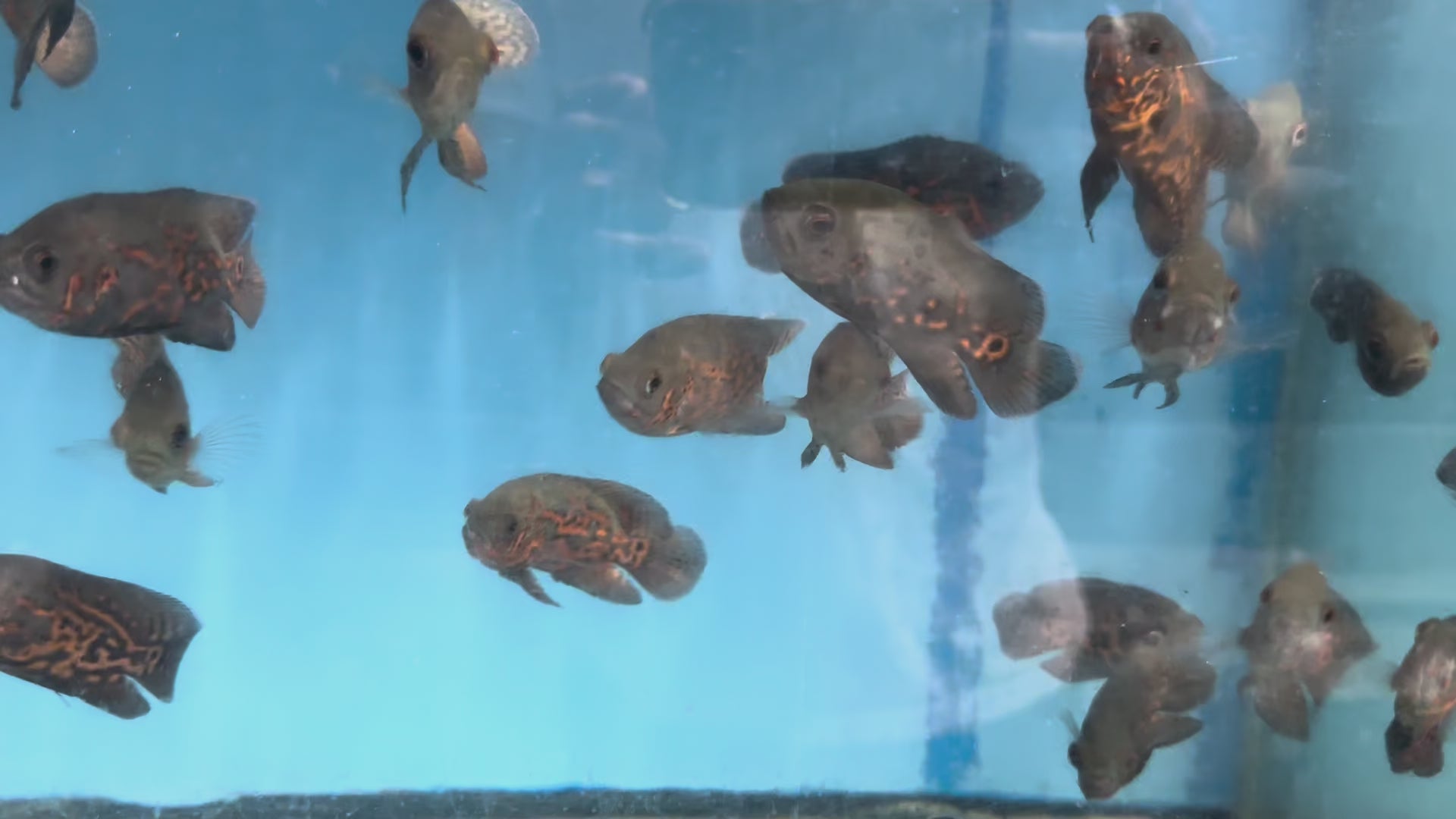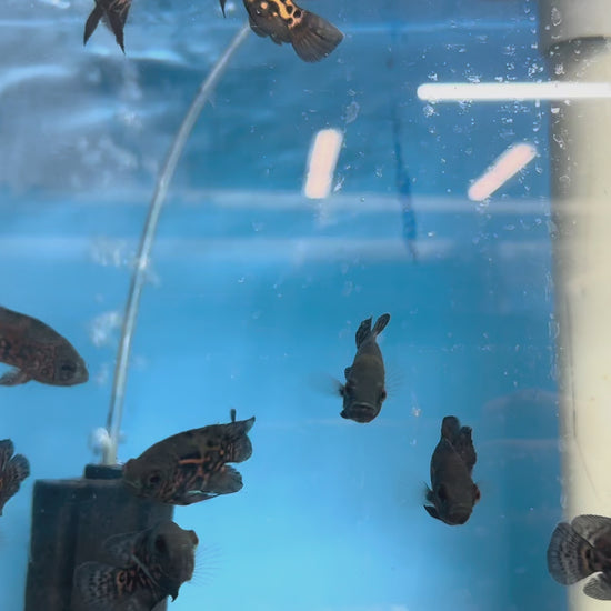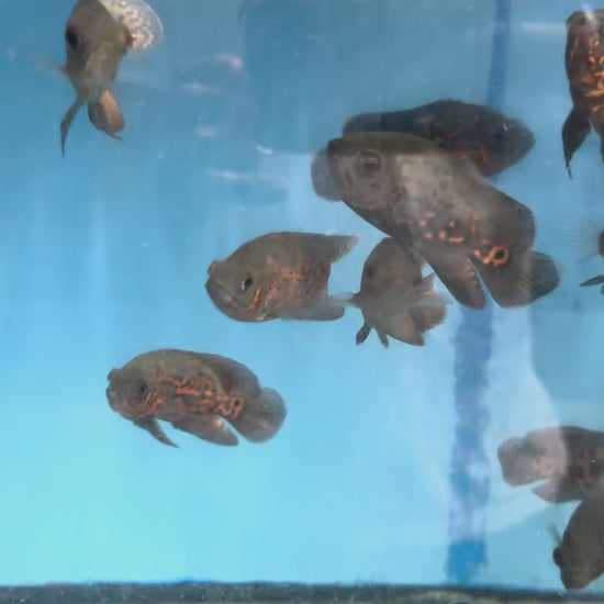 The Red Tiger Oscar, scientifically known as Astronotus ocellatus, is a popular color variation of the Oscar cichlid. It features a dark (blue-black) background with vibrant orange-red markings and patterns, sometimes described as resembling a tiger's stripes or a marble pattern. These fish are known for their striking appearance and are a popular choice for aquariums.