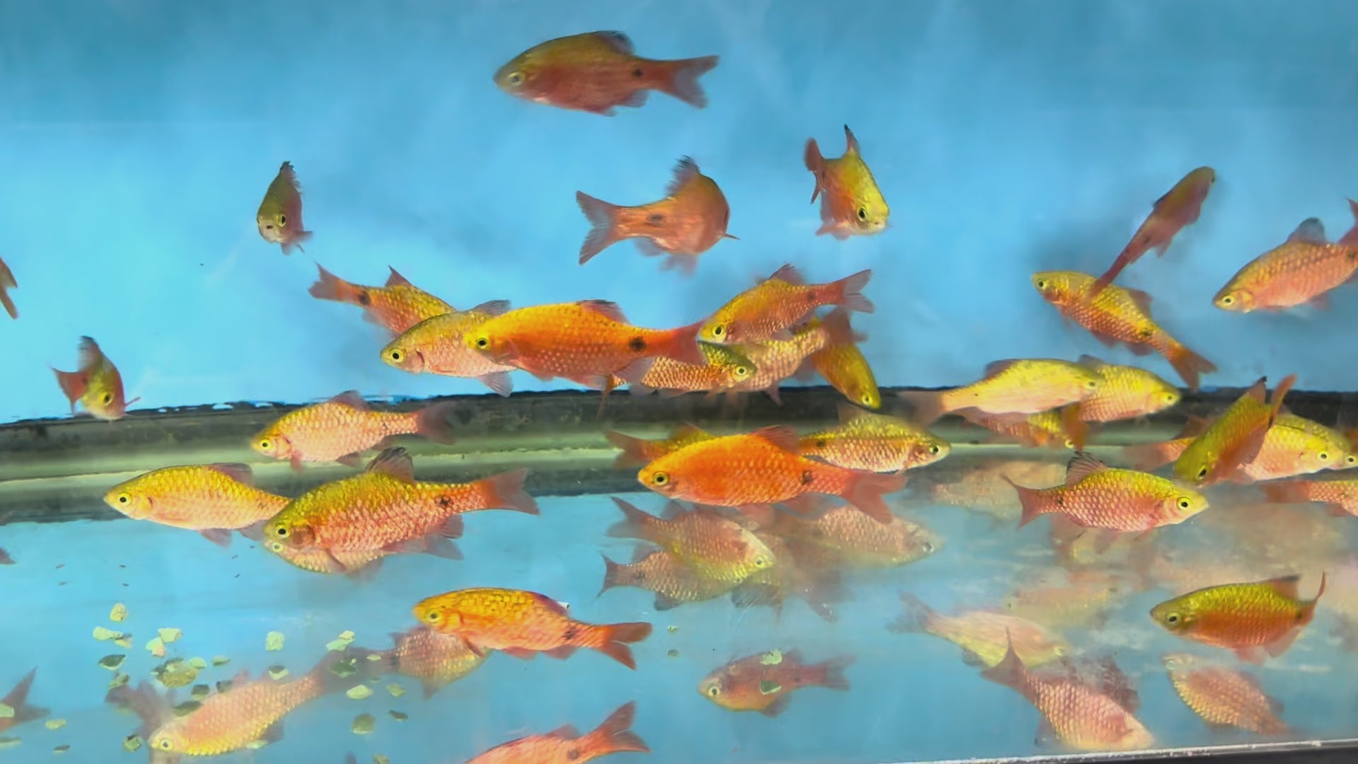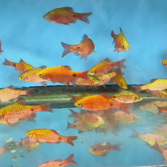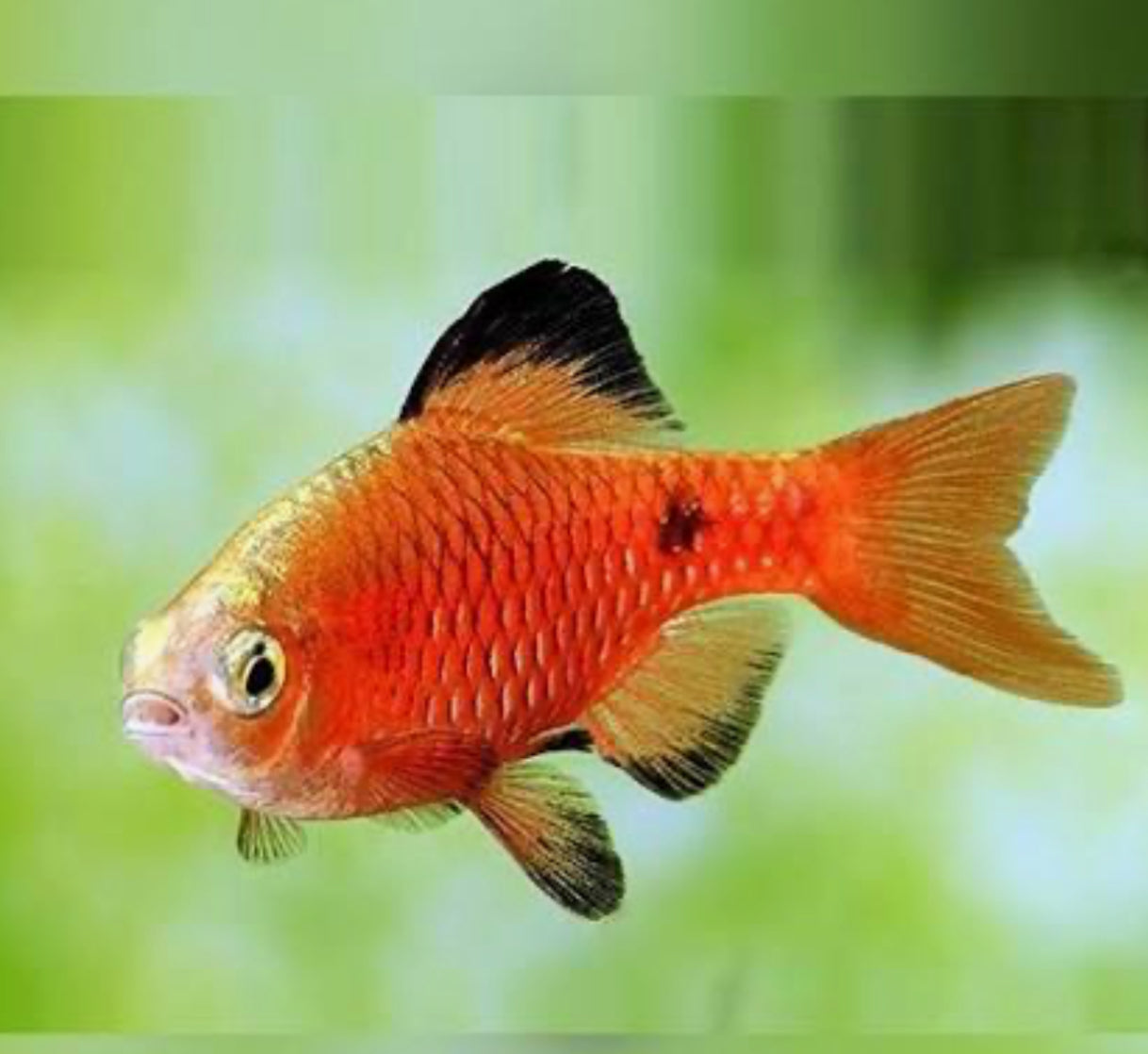 Rosy barbs are active, schooling fish with a typical barb shape, reaching up to 6 inches in length. Males are a vibrant rosy-red color, while females are more golden and slightly plumper. They have an oval body, a forked tail, a prominent black spot near the tail, and transparent fins with subtle black edging.