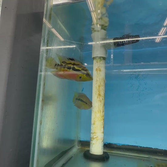 Salvini cichlids, also known as Tricolor cichlids or Yellow Belly cichlids, are vibrant freshwater fish native to Central America. They are characterized by their bright yellow bodies adorned with black markings and red accents. Both males and females are colorful, with males often displaying longer, more pointed fins and sometimes more intense coloration.
