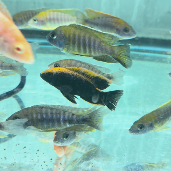 Sulfurhead Peacocks (Aulonocara maylandi) have males that show a unique black body and yellow "blaze" from the nose to the dorsal fin sets this species apart from other Aulonocara.