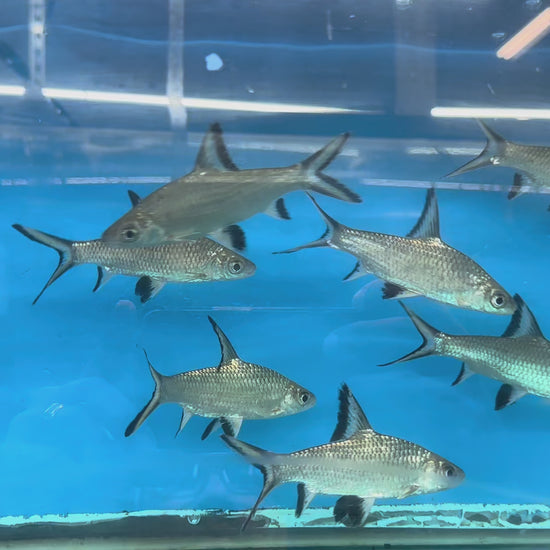 The "Tri Color Shark," also known as a Bala Shark or Silver Bala, is a popular freshwater fish known for its peaceful nature and striking appearance. They have a silvery body with a yellow and black dorsal and caudal fin. These fish are native to Southeast Asia and are often found in midwater depths of rivers and lakes. Despite their name, they are not true sharks but rather a type of cyprinid, resembling sharks in body shape